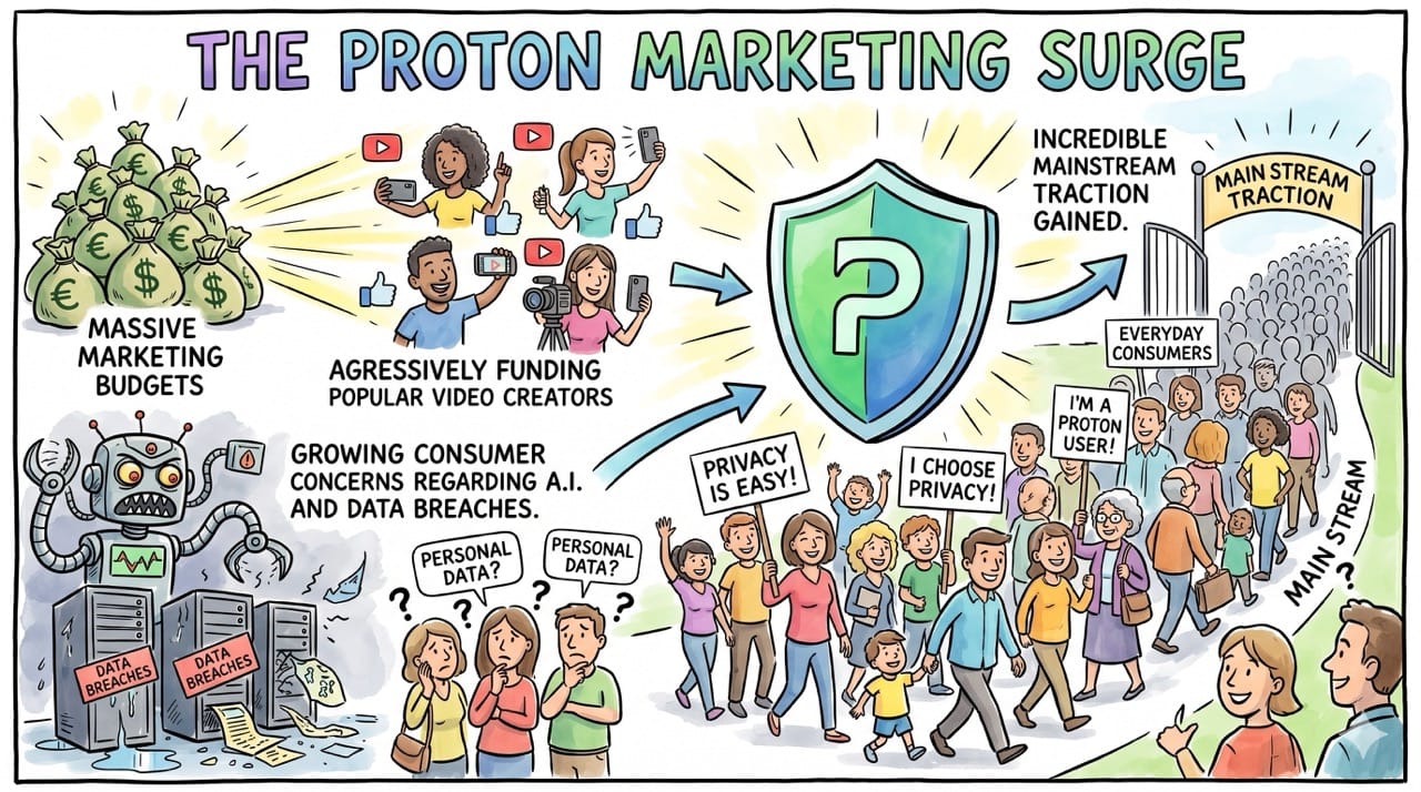 Proton is aggressively funding popular YouTube creators and deploying massive marketing budgets to reach everyday consumers outside the cybersecurity niche.