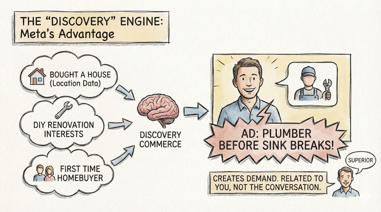 The Result: Meta shows you an ad for a plumber before your sink breaks. This is Discovery Commerce.