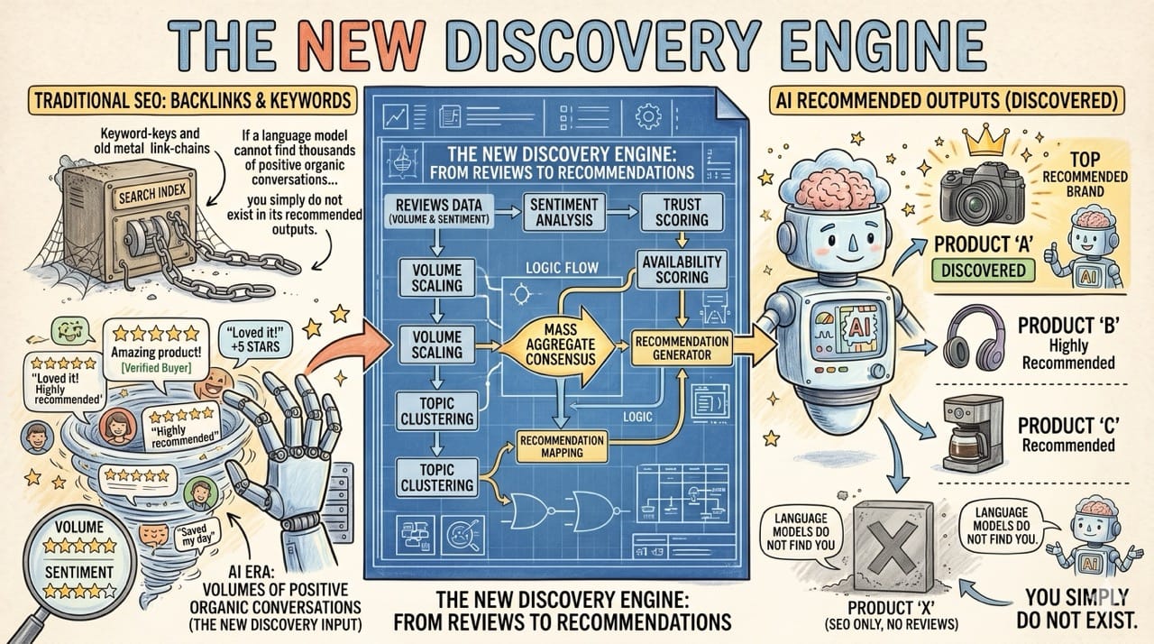 Inspiration: Analyzing how massive datasets from forums like Reddit fundamentally train the behavioral logic of large language models. Realizing that organic customer reviews will become the absolute most critical performance marketing metric in the algorithmic shopping era.